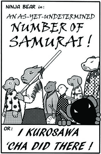 Ninja Bear #2 was finished a year later. I had an inkling that I was going to do this for a while, but I wasn't exactly sure what would happen. So, I wrapped up the Stay as you are. storyline, gave Ninja Bear a new friend, introduced a shadowy cabal of mysterious villains whose boss remains unseen, then had Ninja Bear wander around a bit encountering diversions. It's expanding the world a bit while I'm killing time, figuring out where it's all going.